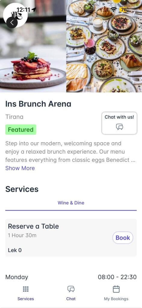 E gjen In’s Brunch Arena dhe rezervon lehtësisht. Si? Hap aplikacionin, kërkon In’s Brunch Arena, te seksioni i Dining dhe shikon disponueshmërinë e tavolinave në kohë reale. Zgjedh orën që do dhe numrin e personave. Gjithë procesi brenda 60 sekondave.